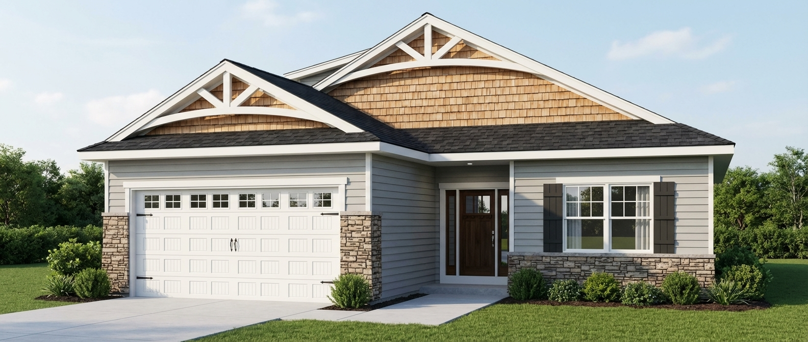 The exterior showcases classic Craftsman styling with a welcoming front porch and a blend of materials such as shake siding, lap siding and stone accents—delivering strong curb appeal and timeless architectural charm.